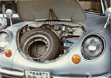 フロントにラッゲージルームが有り、スペアタイヤ、バッテリ、ヒューズボックス、ブレーキのマスタシリンダが見える。タイヤはチューブタイプ、ホイールは一体式ではなくボルト&ナットによる分割式(パンク修理した時にチューブを組み込む際は、チューブの噛み込みに注意を払いましたっけ・・・)