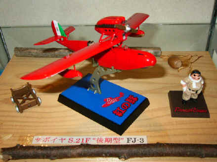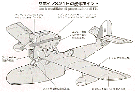 この映画に出てくるサボイアS21&S21Fはいずれも架空の戦闘艇で、今回製作にあたり二機同時進行しました。なかなか作り応えが有り、実在していたのではないか? と思えるほど完璧な仕上がりとなりました。みなさんご存知だとは思いますがS21が単座、S21Fがフィオを載せるために改造した複座(エンジンもフィアットAS.2へ換装)となっています。 ゛F゛はフィオのFかフィアットのFか、ご覧のみなさまのご想像におまかせします。