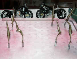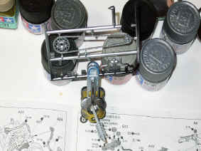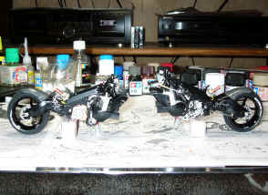 レーシングスタンドを簡易塗装し、Frサスペンション及びFrフエンダの取り付け |