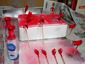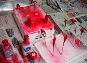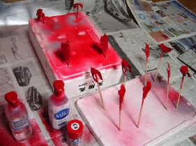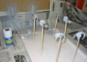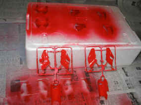 合わせ目が目立つ部分はパテ成形し、Mrサフェーサ1000#を塗装:赤は低隠蔽塗色の為 |